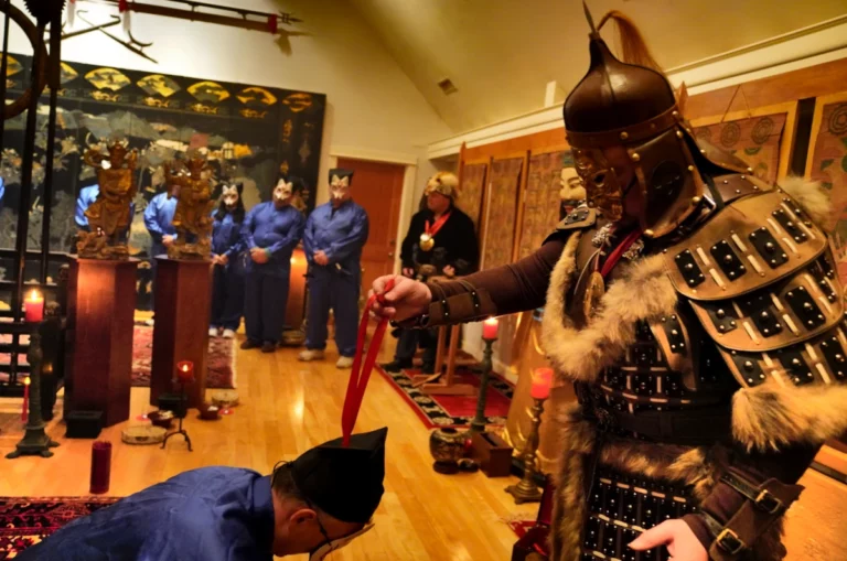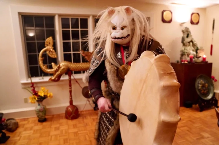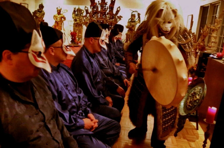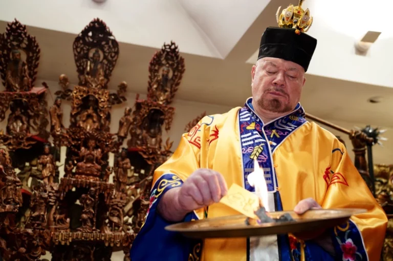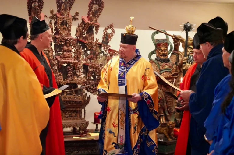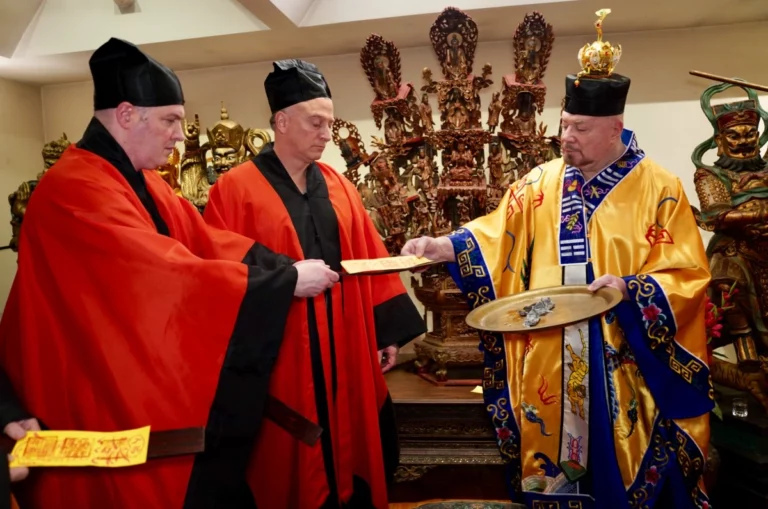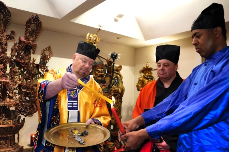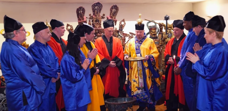 Grand Master Alex Anatole conducting the annual Taoist Ceremony of Protection for the senior disciples of the Taoist Temple to ward off the influences of malevolent spirits. In this procedure the Grand Master performs the sacred practice of inviting a Spirit to the image of a Celestial Deity.