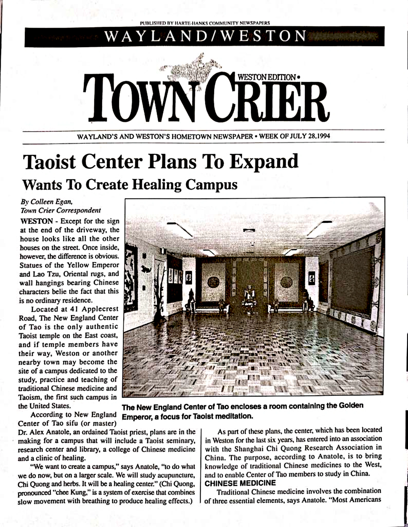 As part of these plans, the center, which has been located in Weston for the last six years, has entered into an association with the Shanghai Chi Quong Research Association in China. The purpose, according to Anatole, is to bring knowledge of traditional Chinese medicines to the West, and to enable Center of Tao members to study in China.